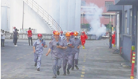 本次应急处置演练模拟瑞安汇源贸易有限公司4号储罐(甲苯)正在作业时,管道法兰垫片损坏,无法承受压力,引发甲苯泄漏事故。演练现场,该公司有毒气体探测报警系统检测到“有毒气体”,汇源贸易公司立即启动应急预案,做好人员引导疏散并立即报警组织自救。接到报警后,应急小组成员立即赶赴现场,制定处置方案,协调指挥各参战单位按职责开展灭火救援行动;派出所民警设置警戒线、疏散围观员工;交警中队陶山中队指挥疏散交通,避免群众围观造成二次事故;潘岱街道专职消防队立即扑灭明火关闭罐底阀门,解救被困人员,指挥被困人员按规定逃生路线撤离现场;潘岱街道卫生院的医护人员对营救出来的“伤员”进行救治;环保部门对事故现场环境进行消纳和评估。