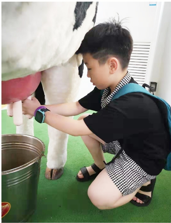 在展览区内,有一头按照1:1比例设计的荷斯坦奶牛模型,小记者们跃跃欲试,依次体验了挤奶过程。