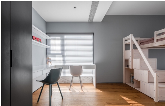 答:七字形书桌满足了两个孩子同时学习的要求,上下铺的双人床更能培养两个孩子的感情。为了方便孩子夜里上厕所,墙面设了小夜灯。