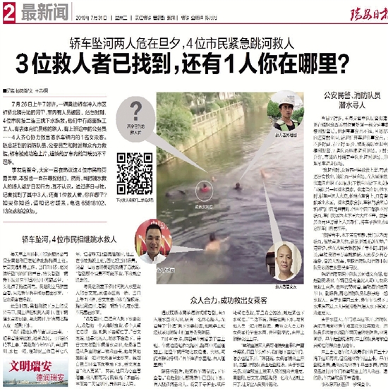 事发后,这4位市民的英勇之举受到广泛关注。由于当时跳水施救的4人都是自发行为,互不相识,通过多日寻找,只找到了其中3人,他们分别是:吴继刚、曾文友、陈磊(相关报道详见7月31日2版)。