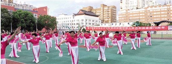 今年8月8日是我国第11个“全民健身日”,主题是“健康中国行动”。昨日上午6时许,塘下镇武术协会木兰队队长庄春微、副队长陈成妹带领100多人上演木兰拳表演。