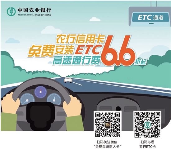 温州农行信用卡持卡人,可至全市各农行网点办理ETC高速通行业务,免费送OBU设备。
