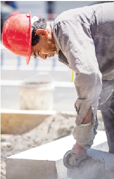 万松路改造提升正在紧张施工中。14时许,60多岁的华师傅戴着安全帽,脸上冒着密密的汗珠,正在奋力切割大理石,为万松路上的绿化带安装护栏。