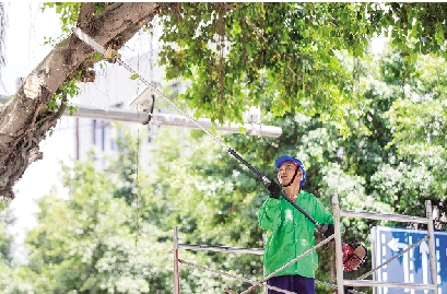每年夏季,50岁的绿化养护工王朝福与同事们要负责道路两旁行道树的修剪工作,一来防止大风刮断树枝,二来让市容市貌更美观。