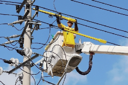 烈日下,国网瑞安市供电公司工作人员叶世展在塘下镇海阳792线进行带电作业。