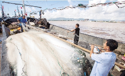 顶着烈日的炙烤,渔民们正为出海捕捞作业做准备。