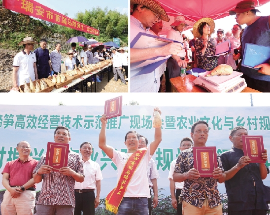 8月13日,马屿镇江北村马蹄笋示范基地举行瑞安市首届马蹄笋王评选活动。活动现场,全市20个村庄25户农民将挖来的马蹄笋拿来争评笋王(上左图)。专家们对重量、品质和外观的综合因素进行测评、打分评选(上右图)。最后,来自湖岭镇岙底村的郑法弟以一株重1.92公斤的马蹄笋夺冠,赢得1000元大奖(下图)。