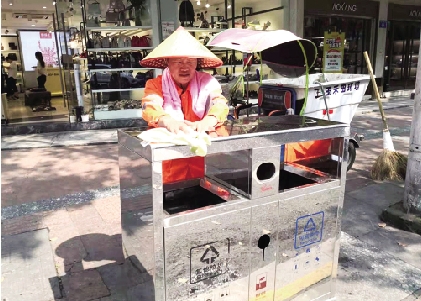 这条路,谢娥书在心里将它分成了好几个标段,每100米是一段。她先将街边和商店门前的垃圾清扫下,然后再拿下车上的水桶、清洗剂和毛巾,先将垃圾桶擦拭一遍,之后用清洗剂洗一遍,再用清水擦干净,然后开着电动三轮车行驶至下一个标段,继续做着同样的工作。如此看似简单而又枯燥的工作,她每天从上午5点干到7点,再从下午12点干到18点。记者估算了下,一条800米的路,她每天得将它反复清洁七八回。