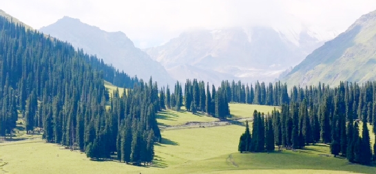 高中时的《天山景物记》写道,天山绵延几千里,不论高山、深谷,不论草原、湖泊,不论森林、溪流,处处有丰饶的物品,处处有奇丽的美景。从那拉提出发,刚进入国道,书上那些景物登台亮相。那是怎么的画面,集三千宠爱于一身,雪峰,森林,草原,溪流,这些经典景象,有序交叠,交相辉映,逶迤绵延。积蓄多少年的神往,在窗外风景闪过时,被一抹雪峰捕获,被一片草甸击中,被一弯溪流召唤,被一点毡房吸引,化作时时刻刻的凝眸。我们惊叫,我们停车,我们拍照,但还无法消解蓬勃的激动,我们便替代司机自己驾车。不,这还不够,最后我爬上天窗,同伴撑着我,我用手机一路录制视频。但,任何溢美之词,任何视频,都不如亲眼所见。同伴说,还是多眨眨眼,尽量把它们装在眼睛里带走。