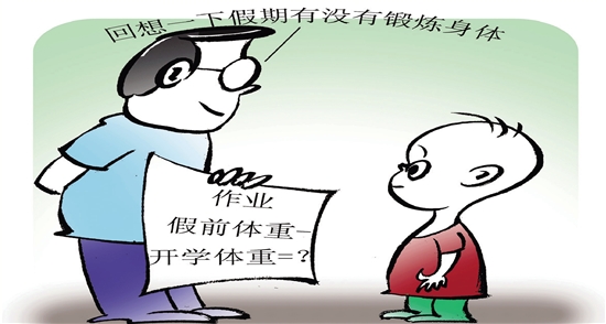 放暑假前,绿苑小学给每位学生布置了一项暑期运动作业单:称称自己的体重。9月2日是开学第一天,学校又布置了作业:回家再称称体重,比较一下,回想暑期里做过哪些运动?校长王晶出这道作业题的缘由是,每年暑期总是孩子体重飙升的高发期。