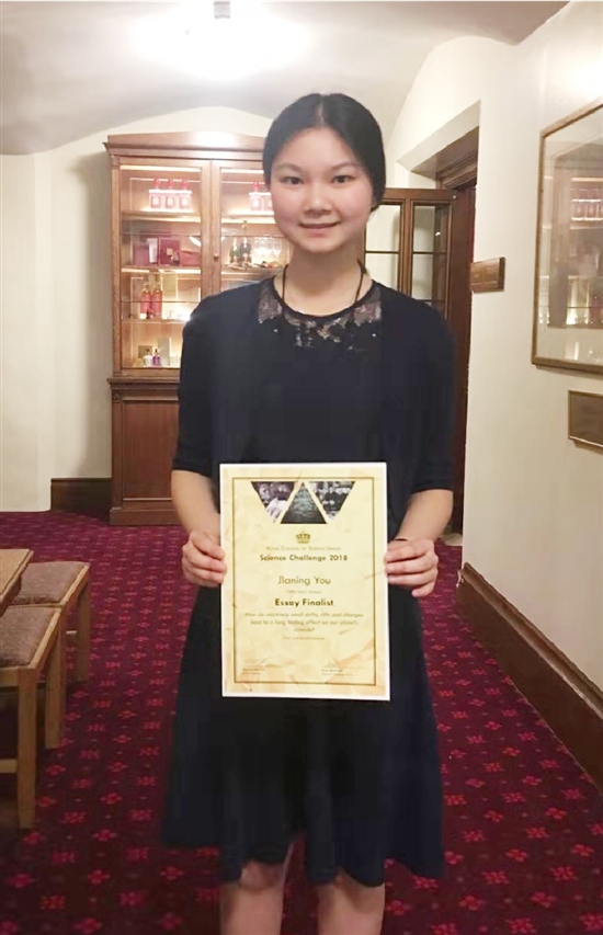 此外,尤佳凝积极参加数学、生物和化学竞赛,成绩都十分亮眼。例如,她参加英国科学联合会皇家学院的2018年度科学论文竞赛,获得全英第三名(见下图)。
