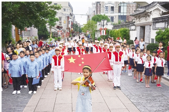 在外滩曾联松像前,讲讲国旗设计者曾联松爷爷的故事;在瑞安地标公园路上,拉小提琴、唱红歌;在校园里的瑞安中共一大会议旧址纪念碑前,朗诵《国旗颂》缅怀先烈;在孙怡让大厅,致敬学校创办者清末大儒孙怡让;在学校操场上,举行庄严的升旗仪式……