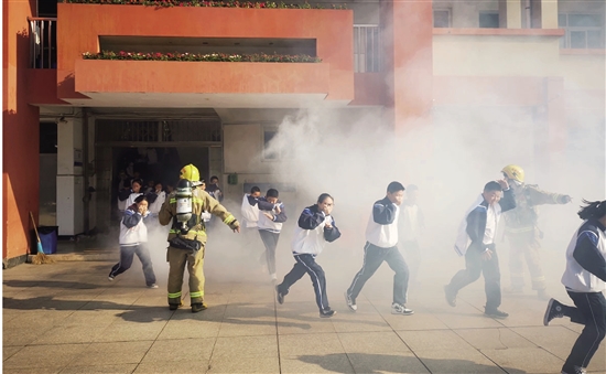 日前,莘塍街道专职消防队队员走进莘塍一中开展消防安全演练。随着浓浓的烟雾弥漫开来,校园里响起了紧促的警报声,该校全体师生进入演练状态:正在上课的老师立即停止了讲课,迅速指导学生用袖子捂住口鼻,降低身体重心,快速、有序地从各自教室疏散到开阔的操场上。