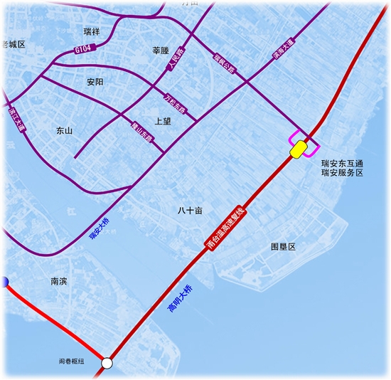 首先从位置上看,瑞安东互通口位于滨海大道以东,瑞安东互通连接线(即瑞枫公路延伸线)与滨海大道交叉,一直连接到东新路(人民路)。