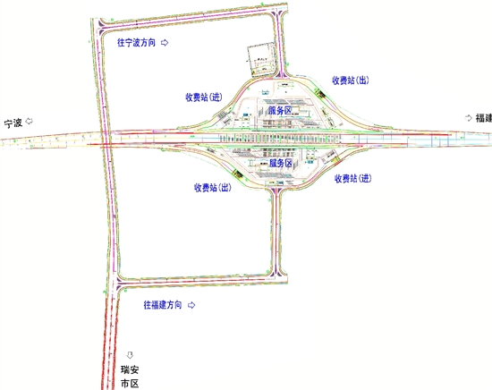 因此,瑞安东设有收费站4处,进出口各2处,往宁波方向和福州方向的高速收费口并不在同一处。瑞安东还有瑞安境内最大高速服务区——瑞安服务区,设计上与瑞安东互通融为一体。