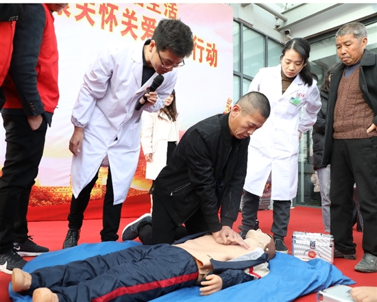 在另一侧,上望街道社区卫生服务中心的2名医务人员现场传授心肺复苏急救技能。“发现有人晕厥,首先要判断其意识、呼吸、心跳,听呼吸音用颊部感受气流,看胸部起伏,同时摸近侧颈动脉搏动,判断无搏动时,及时向路人求救,同时拨打120,然后开始有规律的心肺复苏,力度要稍大,注意频率……”医生的现场授课,吸引不少新居民跃跃欲试。在医生的指导下,他们认真练习,既真切感受到生命的宝贵及学习心肺复苏急救的重要性和必要性,又能提高自身应急救护能力——在安全意识与应对能力方面都收到了良好的效果。