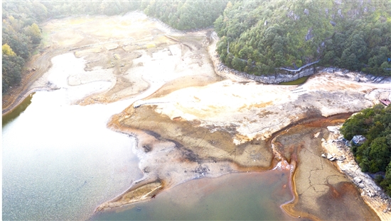 眼前的桐溪水库,水位下降明显,原本在水下的岩石大面积裸露在外,水库两侧接近干涸,露出河床。通过航拍可以清晰看到,水库里的水量仅集中在中间湖心岛四周,因缺少充足湖水的桐溪风景区,被光秃秃、土黄色的岩石“包裹着”,岩石将湖水与山体景色完全隔离开。