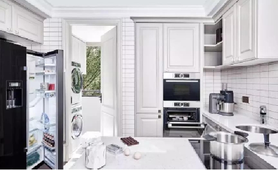 冰箱:冰箱的选择,首先根据人数选择合适容积的冰箱,再根据喜好、住房面积等进行调整。如果对于整个厨房设计要求比较高的,还可选择嵌入式冰箱,完美融入家居设计中。