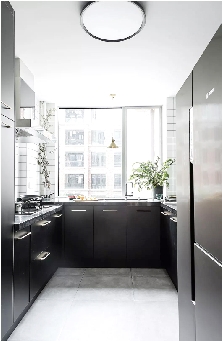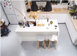 面积合理后,还需注意橱柜台。一般来说,人在厨房活动时,前后距离起码达到0.9米以上的距离才行,因此橱柜的宽度以0.6米为宜。还要根据厨房宽度来安排,若是厨房净宽仅1.5米,那最好是安装单排橱柜;如果厨房净宽大于2.1米,那可以设置双排橱柜。