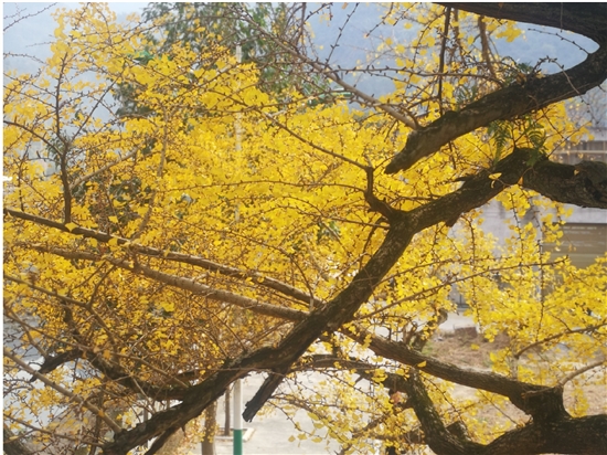 多年前的一个初冬,我在清华大学参加短期培训,如刘姥姥进了大观园,我对清华园的一草一木都倍感新鲜新奇。上课之余我总是在清华园里转悠着,一天清晨,当我骑着自行车转过几条小道,突然一道金灿灿的亮光闪现在眼前,那亮光让人耀眼,让人心醉,让人措不及防。我即停下脚步细细端详,原来此地就是清华园的银杏道,金色的银杏倒映在清澈的河水中,妩媚动人。晨风中一枝枝黄叶摇曳着,跳跃着,如灵动优美的音符,如一首首抒情的小诗,我完全被眼前的美景迷住了,手机拍了一张又一张,久久不愿离去。