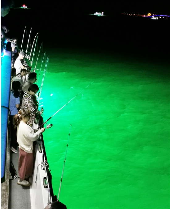 晚上,去夜钓鱿鱼。在南海游客中心码头找了一艘专门钓鱿鱼的休闲船,在机器轰鸣声中,御风而行,出海夜钓,也是人生中的第一次海钓。
