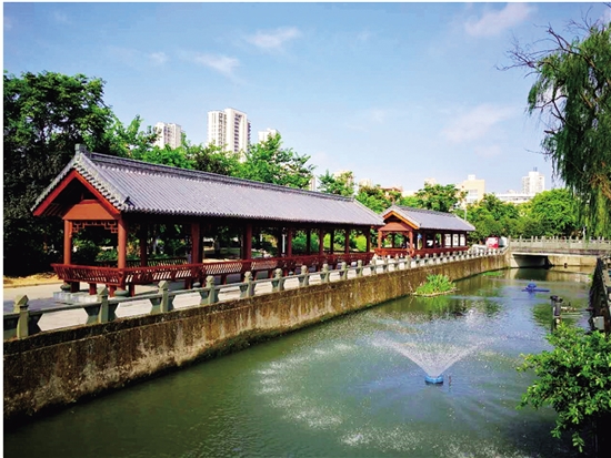 公园里有一条小河,岸边垂柳依依,河水碧绿清澈,长廊影月,引来了不少垂钓者。瑞安著名书法家林峰写的廊亭对联“迴廊邀澹月,垂柳钓清泉”在这里得到印证。