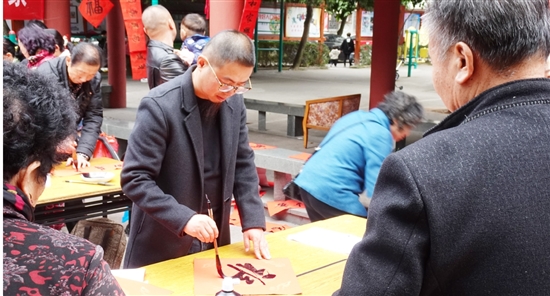 乡贤翁文经是我市知名书法家,一直致力弘扬、传承优秀传统文化。每年春节,他都会前往社区、学校、乡村等各处,为大家写春联、写“福”字。1月12日上午,他来到桃源社区,为居民写春联,送“福”。他一到社区文化广场,就挥毫泼墨,忙碌开来,一副副对联,一个个“福”字,从他笔下诞生,社区居民们争相索取。