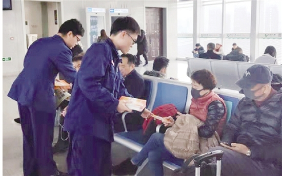 本报讯(记者 黄丽云 通讯员 王勤剑)“您好!我们是消防宣传员,提醒您冬季注意用火用电安全,这是消防安全知识手册,您在旅途中了解一下,愿这些知识能给您和您的家人带来平安!”近日,市消防救援大队联合市交通运输集团有限公司及飞云街道,走进市客运中心站、瑞安动车站等场所开展消防安全知识宣传,为春运高峰期往来的旅客送上“平安礼”。