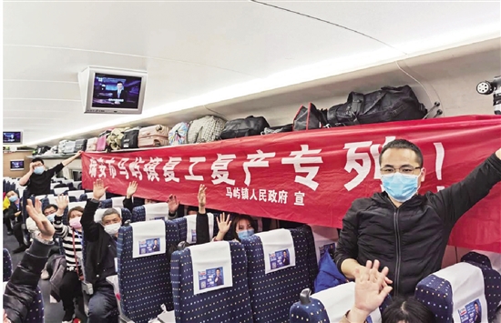 据了解,这趟列车是马屿镇复工复产专列,也是我市首批由乡镇牵头组织的复工返岗员工专列,费用由财政埋单。2月25日,该镇10名机关干部和随行医生组成复工复产招工专班,分赴成都、重庆、遵义等5个地方组织返岗人员。专列历时3天,来回7000多公里,接回返瑞人员480多人,其中马屿返岗员工200多人。