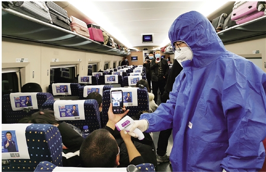 2月28日21时26分,G4983次专列在温州动车南站停下。随着列车门徐徐开启,车厢里的返岗员工统一佩戴口罩,在工作人员的指引下有序下车。