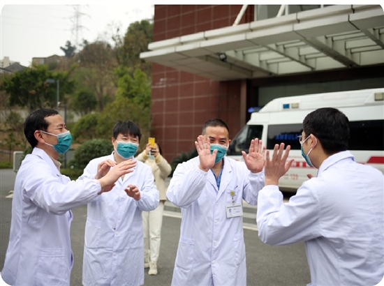 目送患者坐上院后转送车离开,平时看似“高冷”的医护人员互相击掌祝贺,兴奋之情溢于言表,共同奋战的“战友”们还拍照留念。