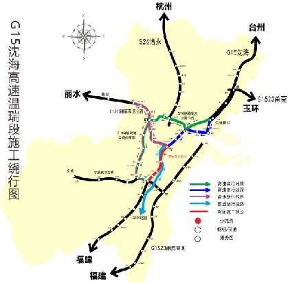 施工期间,请途经车辆按施工路段交通标志通行,服从现场管理人员指挥。瑞安南下车辆从万全枢纽转入G15沈海高速后,将进入平阳隧道群路段,请广大驾驶员务必保持车距,谨慎驾驶。