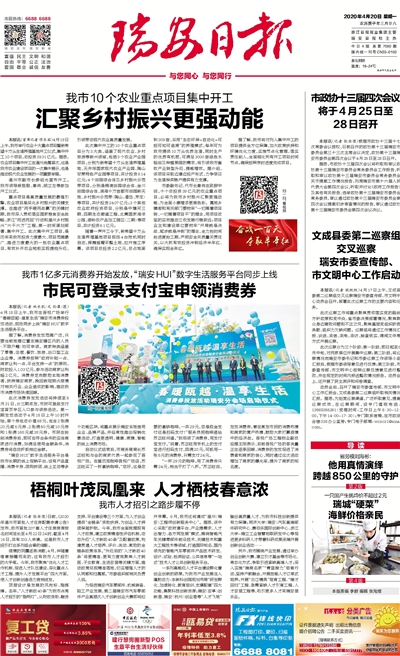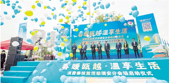 本报讯(记者 林长凯/文 孙凛/图)4月18日上午,我市在吾悦广场举行“春暖瓯越·温享生活”瑞安市消费券投放活动,现场同步上线“瑞安HUI”数字生活服务平台。