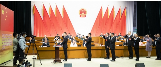 会场,主持人宣读选举有关要求,大会采取无记名投票的方式,依法选举秦肖为市人民政府市长、选举胡丕敢为市人民法院院长。会议还选举陈宗成、陈晓洁、陈智勇、周靖、蔡仁敏、蔡金良为市第十六届人民代表大会常务委员会委员。随后,会议举行宪法宣誓仪式,新当选的市人民政府市长、市人民法院院长、市人大常委会委员向宪法宣誓(如图)。会议还进行了2019年政府民生实事项目完成情况满意度测评, 票决确定瑞安市2020年政府民生实事项目。