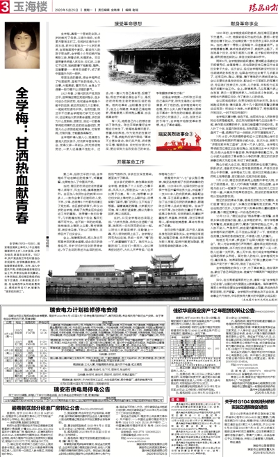 全学梅牺牲时年仅17岁,为了革命事业,她甘洒热血,献出了自己年轻的生命,被誉为“巾帼英烈”“瑞安的刘胡兰”。