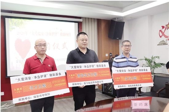 近日,2020年度“大爱瑞安·净血护肾”救助项目启动。市慈善总会、市中医院和健力粘扣带有限公司签订项目捐款协议书,共同出资25万元用于资助困难家庭尿毒症患者,其中健力粘扣带有限公司捐助15万元,市慈善总会和中医院各捐助5万元。