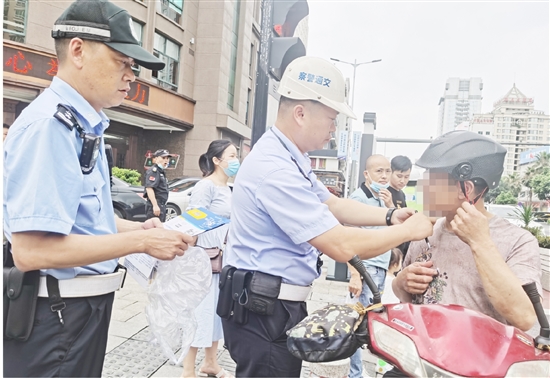 “哎呀,出门太匆忙,忘记戴安全头盔了,做错了,我接受处罚。”被交警拦下的市民蔡先生一边说,一边立即拿出手机扫码缴纳罚款。民警拿出预备的安全头盔,贴心地帮他戴上,叮嘱他骑电动自行车必须佩戴安全头盔。“交警严格执法,是对我们生命安全的保障。下次我肯定要戴好头盔,他们给的传单我也要仔细看一遍。”蔡先生说。