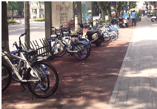 7月13日,安阳路,共享单车随意停放在非机动车道,影响非机动车、行人通行。