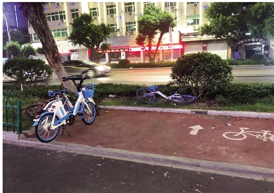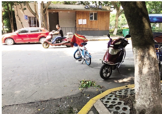 7月15日,万松西路,共享单车随意停放在行车道上,影响通行。