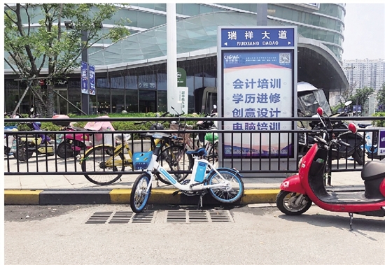 7月13日,瑞祥大道,共享单车被推到护栏上,影响通行和市容市貌。