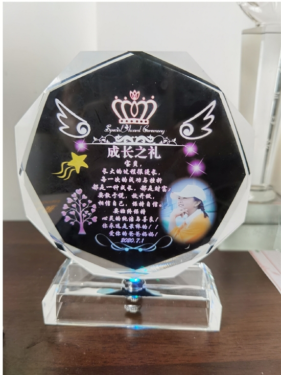 我自惭形秽地接过礼物,缓缓地揭开盒子——展现在我眼前的是一个非常精美的水晶玻璃。上面不仅刻着爸爸对我鼓励的话语,旁边还嵌着一张我远视前方的照片。爸爸说:“这张照片很有意境——似乎你在遥望自己的未来,奋斗吧孩子!不要被石块绊倒就站在原地不动,将来的你一定会感谢今天努力奋斗的自己!”我捧着这个“成长之礼”仔细端详——文字上方的这一对翅膀则是爸爸给我展翅高飞的力量,镶在翅膀中间的这一尊皇冠是爸爸期望我将来能蜕变成自己的公主……那一刻,我感觉礼物沉甸甸的,因为这里面更饱含着爸爸对我的鼓励、期望与用心。我小心翼翼地将它放在我的书桌上,每每触碰到它,就会放射出五彩的光芒,照进我的眼帘,更将爸爸对我所有的鼓励都照进我的心里。
