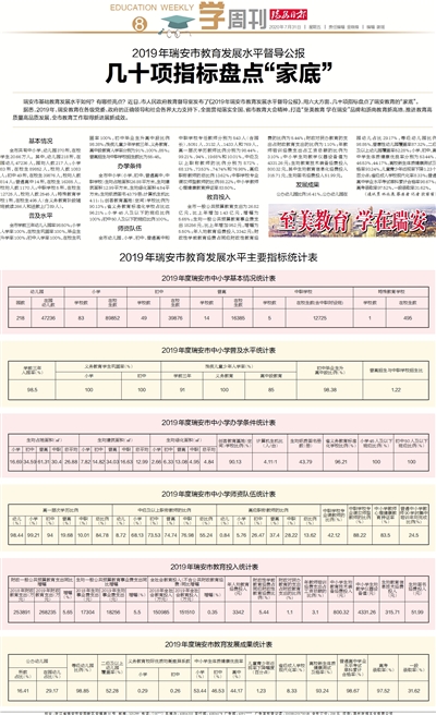 瑞安市基础教育发展水平如何?有哪些亮点?近日,市人民政府教育督导室发布了《2019年瑞安市教育发展水平督导公报》,用六大方面、几十项指标盘点了瑞安教育的“家底”。