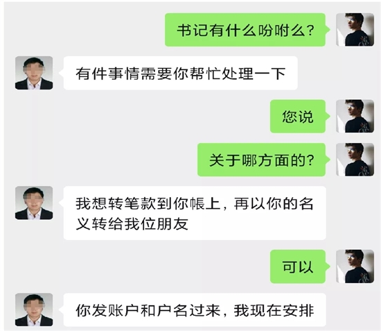 第一步,利用网络信息冒充领导账号,寻找“领导”辖区的受害人;第二步,寒暄慰问,拉近关系,然后提出请求,要你帮忙转账;第三步,受害人答应后,骗子伪造转账凭证(通常会PS一张转账记录的截图),称自己已经把钱转到受害人的账户,并催促对方打钱给其提供的银行账户。如果受害人发现钱没到账,骗子便声称银行到账有时间差。一旦受害人将钱打到其指定账户,就上当了。