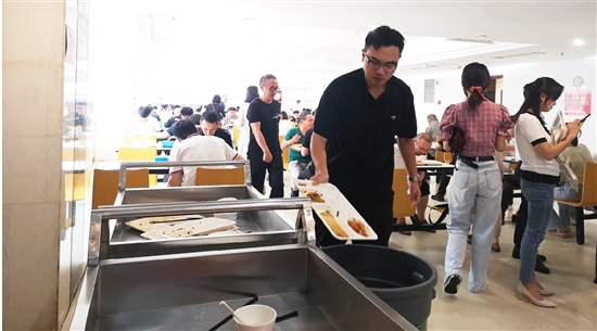 记者发现,当大部分人还在排队时,一些就餐者已经吃完。餐盘回收处放着3个餐盘,易腐垃圾回收桶里仅有一些汤汁、几片菜叶,没有发现浪费情况。有几位就餐者吃完米饭后,又为自己添了一碗。就餐者陈先生吃完饭后,餐盘内仅剩下汤水。他说:“‘光盘行动’以来,大家的节约意识都提高了,自觉做到吃多少打多少。”