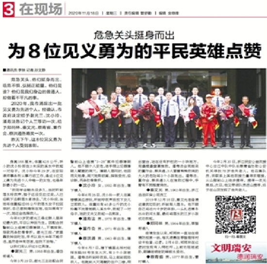 “绿衣侠”王先生奋不顾身跳入飞云江,救起落水女子;鲍田派出所民警金顺权和同事联合救起落水聋哑老人……2020年,这些化险为夷的瞬间,都有一个个挺身而出的凡人英雄。也许,你将忘记这些名字,但他们就在我们的身边。