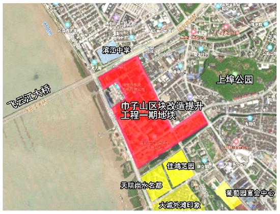 从挂牌文件来看,“巾子山一期”地块紧邻飞云江大桥,位于外滩大厦与天瑞尚水名都之间,北至毓蒙路和瑞光大道,西至瑞祥大道,南至滨江大道、东至沿河。