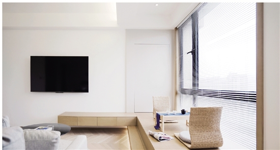 地台上,软装设计师打造了一个小小的品茶空间,两张米色藤质矮人椅,一张原木色小方桌,日式气息扑面而来。地台窗边选用百叶窗,与整体空间意外地和谐,阳光透过百叶的光影,也很美。