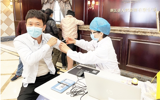 本报讯(记者 金汝 通讯员 林海 陈海平)3月24日下午,莘塍街道社区卫生服务中心、董田卫生院医疗服务队来到新湖广场、浙江圣人鳄服饰有限公司,为400多名员工提供新冠疫苗上门接种服务。