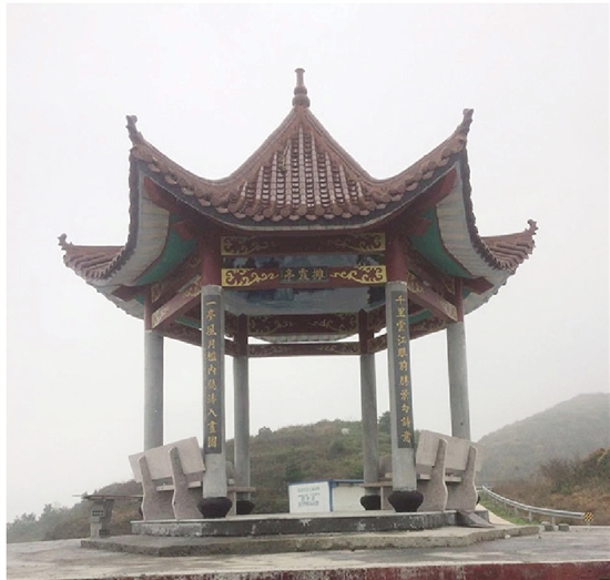 找到那个既熟悉又陌生的亭子,果然是新建的,还没有完工,上书“擁(拥)霞亭”(见上图)。其亭联曰:“千里云江眼前胜景勾诗意,亭巍屋脊双潭白水溪山秀。”则颇值得玩味,可能山中什么地方有一个双潭,盈满白水,我想。