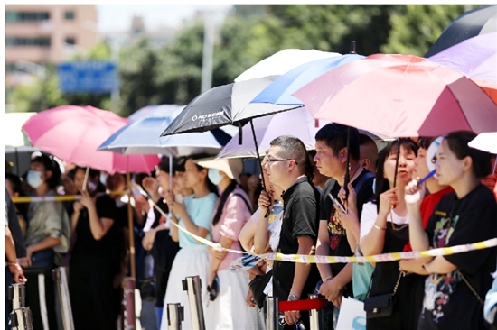 女家长旗袍加身,记者意外发现,不少男家长也罕见地穿上了红色短袖。“我们穿得喜庆点,能展现良好的精神面貌,孩子看着高兴,能减轻心理压力。”有家长说。